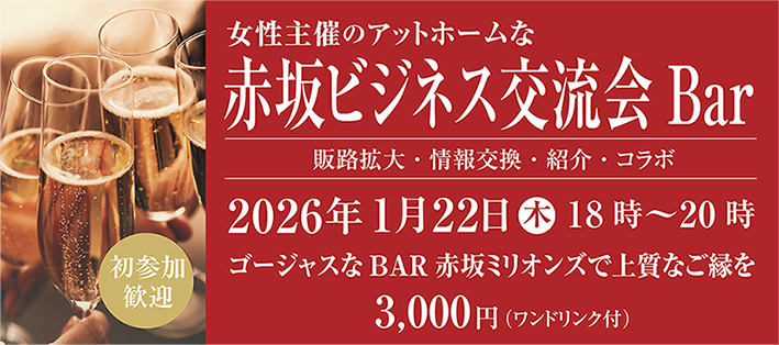 1月22日(木)18時〜20時赤坂ミリオンズにて赤坂ビジネス交流会を開催いたします。 赤坂ビジネス交流会は、女性主催のアットホームな交流会です。 当日、サンプル・パンフの配布、販売もOKです。 会費はワンドリンク付3,0