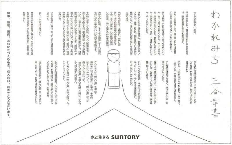 4月1日の新社会人に向けての広告に続いて成人の日のサントリーの広告やはり三谷幸喜さんでした。 三谷さんが成人の日を迎えた方々に何を語るんだろうと楽しみにしていました。 そう考えて僕は「険しい道」を選び続け、今、ここに立っ